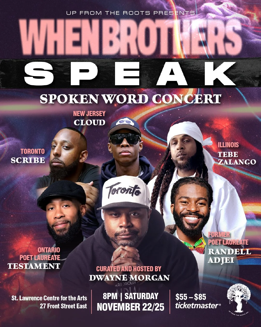 The 2025 edition of the When Brothers Speak Spoken Word Concert returns to the St. Lawrence Centre for the Arts on Saturday, November 22nd, featuring performances by New Jersey’s Cloud, Toronto’s Scribe, Tebe Zalango from Illinois, former Ontario Poet Laureate, Randell Adjei, and new Ontario Poet Laureate, Testament, all curated by yours truly, Dwayne Morgan.